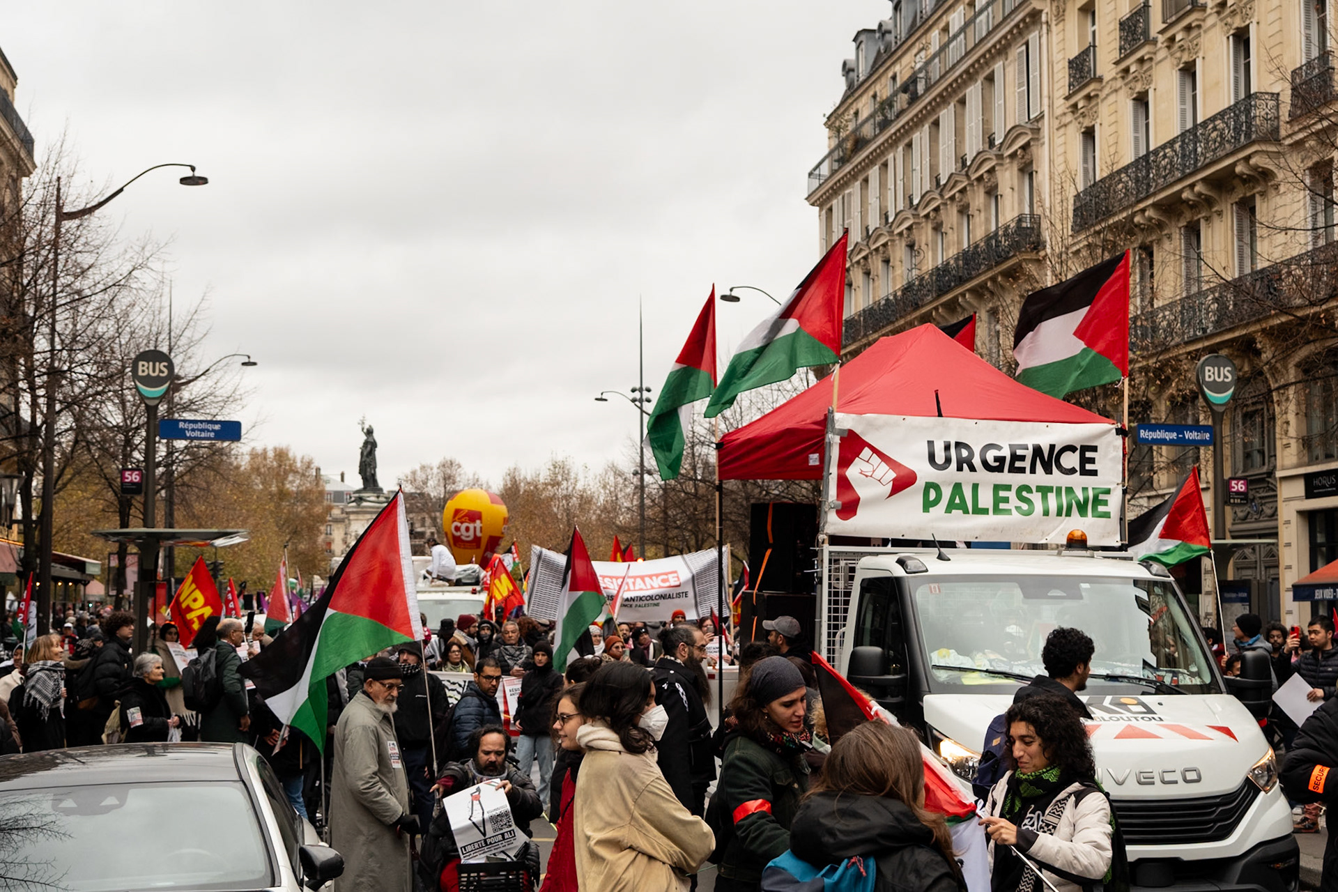Huge crowds in Pro-Palestine protest in Paris, starting in Place de la Republique down to Boulevard Voltaire, various associations, syndicates, parties and simple people from all over Paris and the world to show solidarity & support for a peaceful & lasting solution for the Palestinian people.